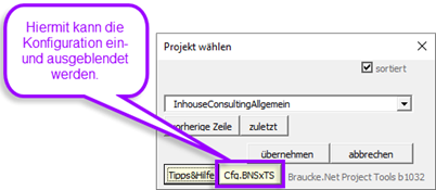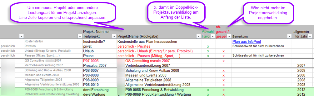Projektnummer: wird in letzter Spalte in vollständigen Projektnamen aufgelöst.